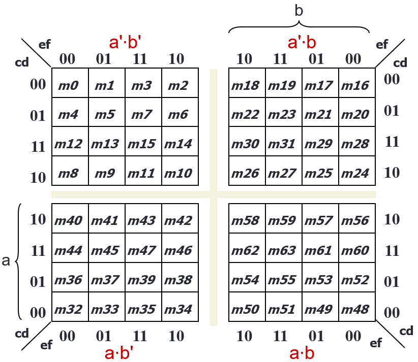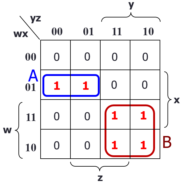 - Two adjacent squares represent minterms that differ by exactly one literal (axes with more than 1)