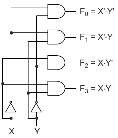 - Any combinational circuit with n inputs and m outputs can be implemented with an n:2n decoder with m OR gates.