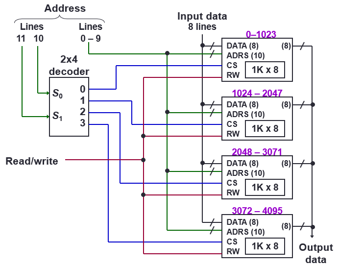 Memory array (4k x 8) made of four 1k x 8-bit RAM chips: this can be extended to larger size
