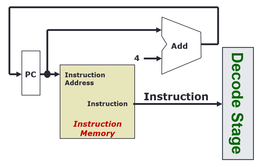 - Every clock cycle, the PC register is updated, with +4 every rising clock edge