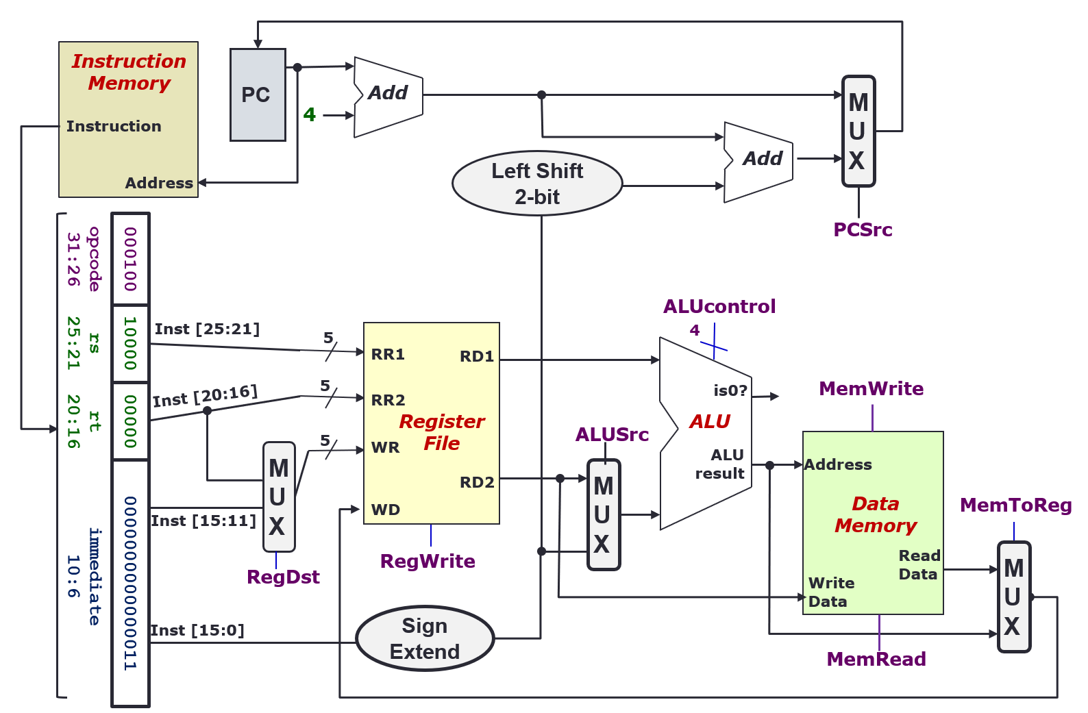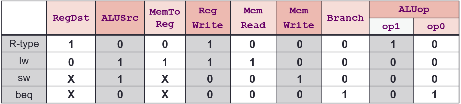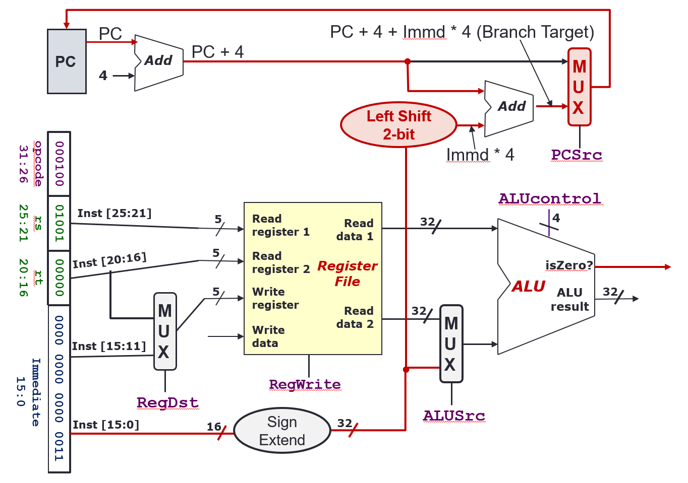 bneetc.): Register comparison and target address calculationALUSrc = 0for ALU to decide whether to branchPCSrc = 1so that PC will be updated with branch target