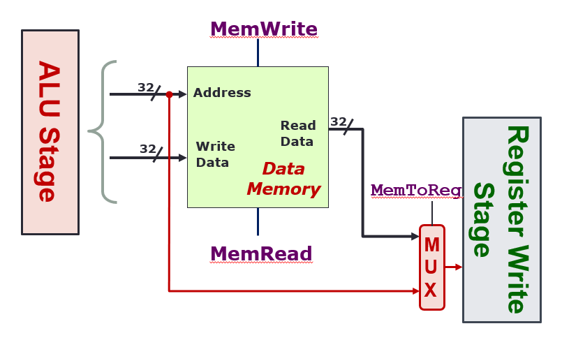 MemReadorMemWritecan be asserted (true) at any time, both 0 means don’t do anything MemToReg: When 0, send the output of the memory stage to the next Result Write stage. When 1, send the output of the ALU directly